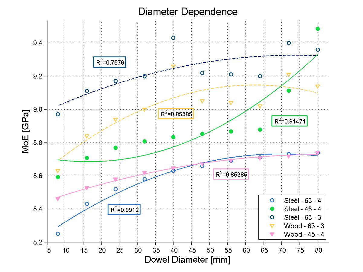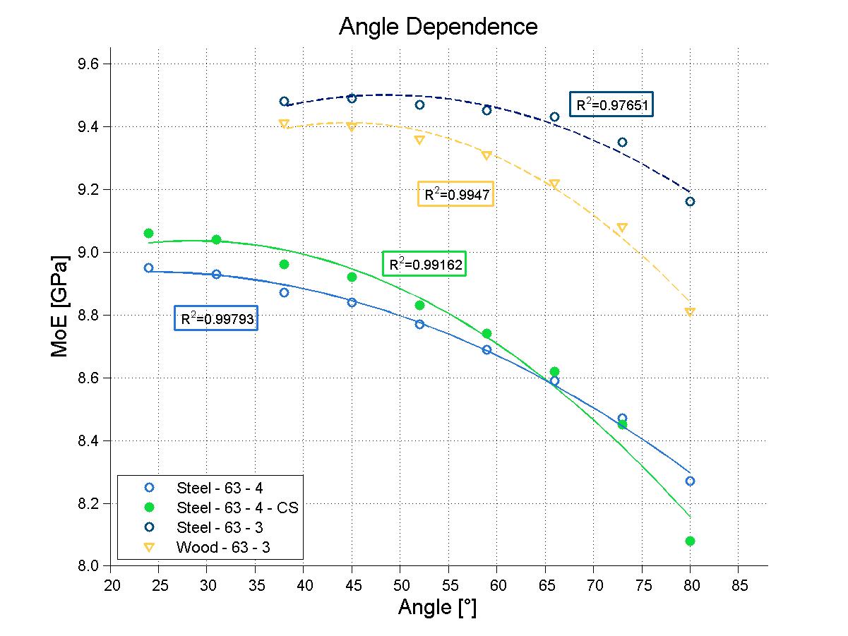 Výsledky destruktivních zkoušek jsou vztaženy k vlhkosti vzorků během měření (okolo 20 %), materiálové hodnoty jsou uvedeny pro vlhkost 12 % (přepočty proběhly dle příslušných norem).