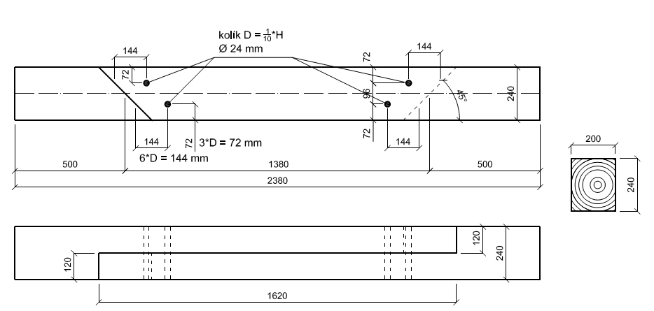 - celodřevěný plátový spoj se dvěma hmoždíky a šikmými čely FVZ-DS3-2014