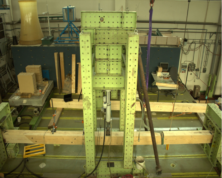 Ověřovací experimenty, jejichž výsledky verifikovaly návrhové grafy pro certifikovanou metodiku. Spoje byly namáhány kombinovaným zatížením v tlaku a ohybu. Kombinované zatížení bylo vyvozeno břemenem o hmotnosti 740 kg zavěšeným doprostřed rozpětí trámu se spojem. Poměr ohybového momentu M a normálové síly N byl určen sklonem prvku stejně jako v případě zkoušek v měřítku 1:4. Zkoušen byl čtyřkolíkový spoj […]