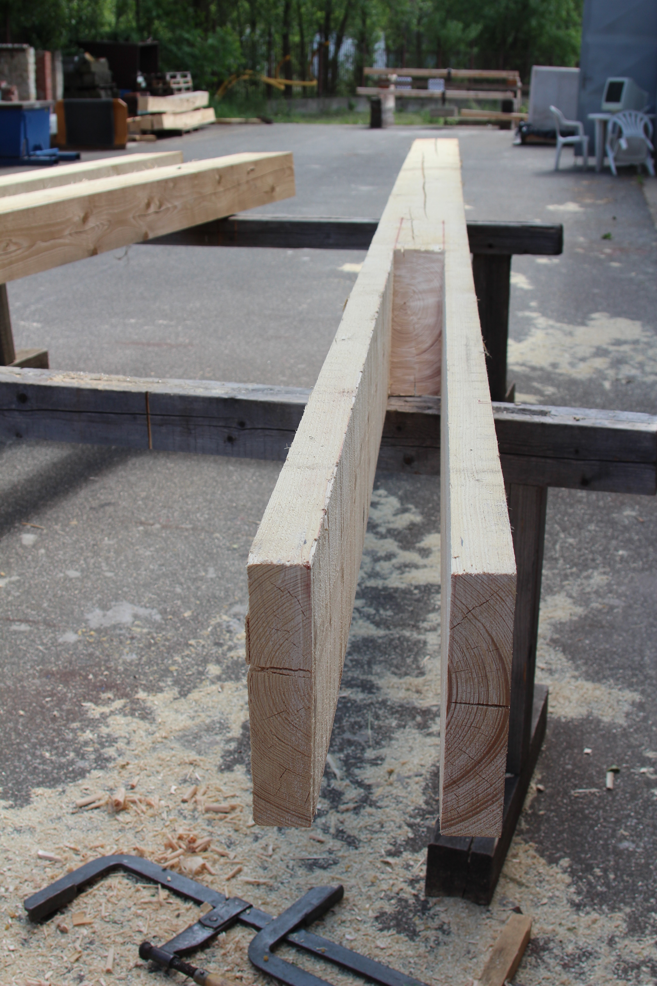Spoj v měřítku 1:1 byl realizován ze smrkového dřeva na trámu s rozměry profilu 200 x 240 mm, vzdálenost podpor byla 6000 mm. Průhyb trámu se spojem byl měřen na pěti místech – 100 mm od podpor, ve středu spoje, v místě vnitřního šikmého čela zatíženého větším ohybovým momentem a uprostřed rozpětí prvku, tj. v místě působení zatížení. Zatěžování probíhalo stejně jako u klasických plátových spojů.